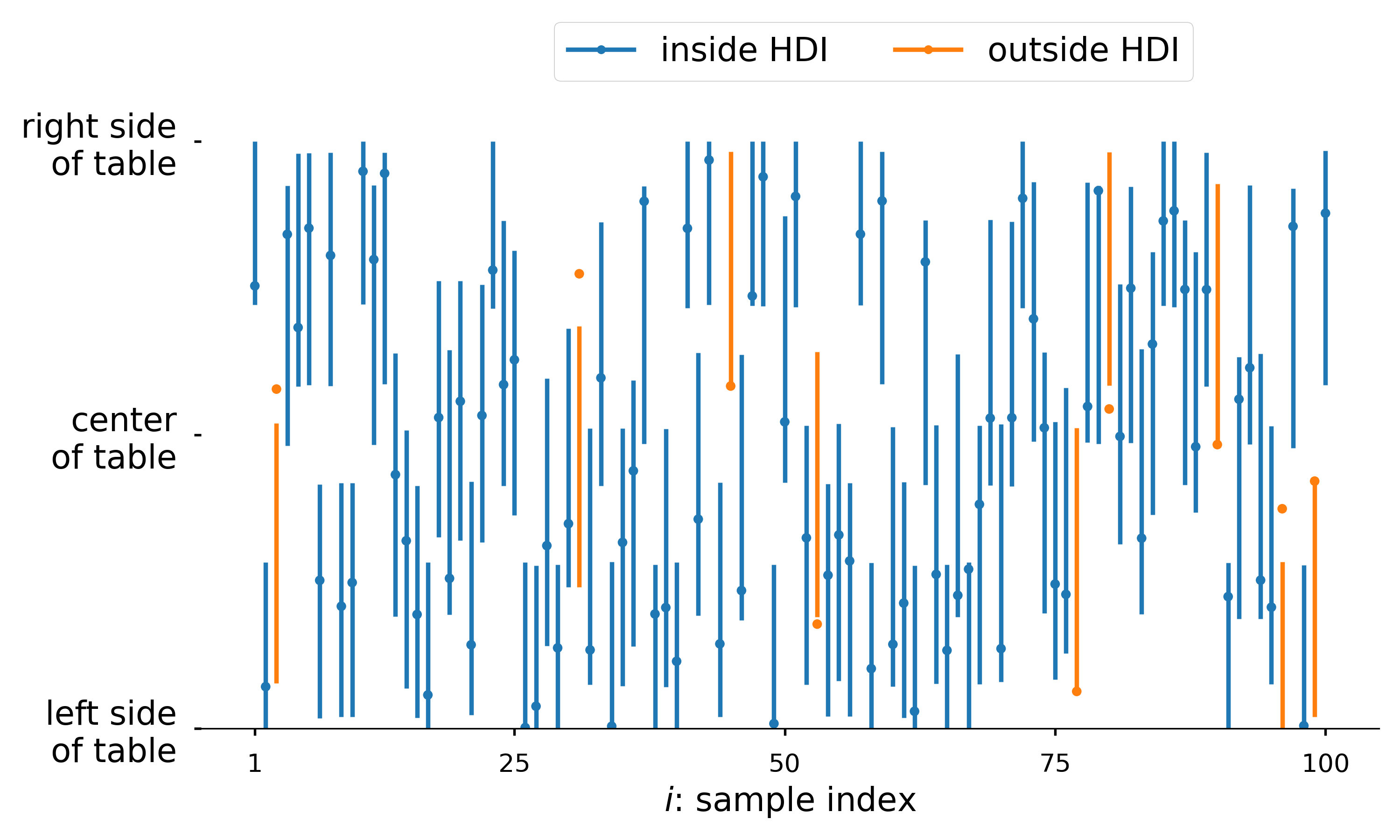 The 90% HDI of our posterior contains x_{i} ~90% of the time as expected