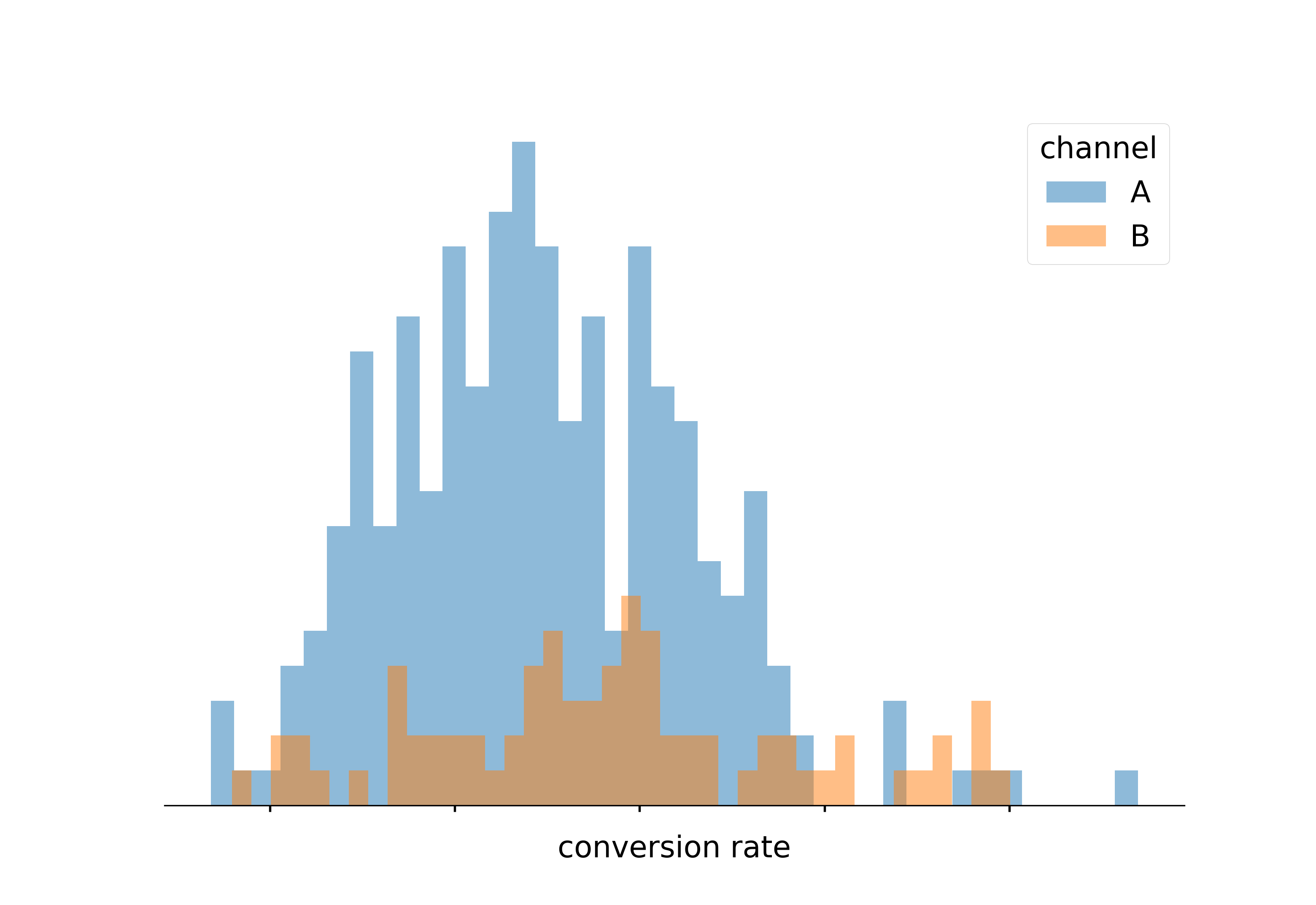 We could consider the probability that one “channel” will outperform another: i.e. p(c_{1} < c_{2})