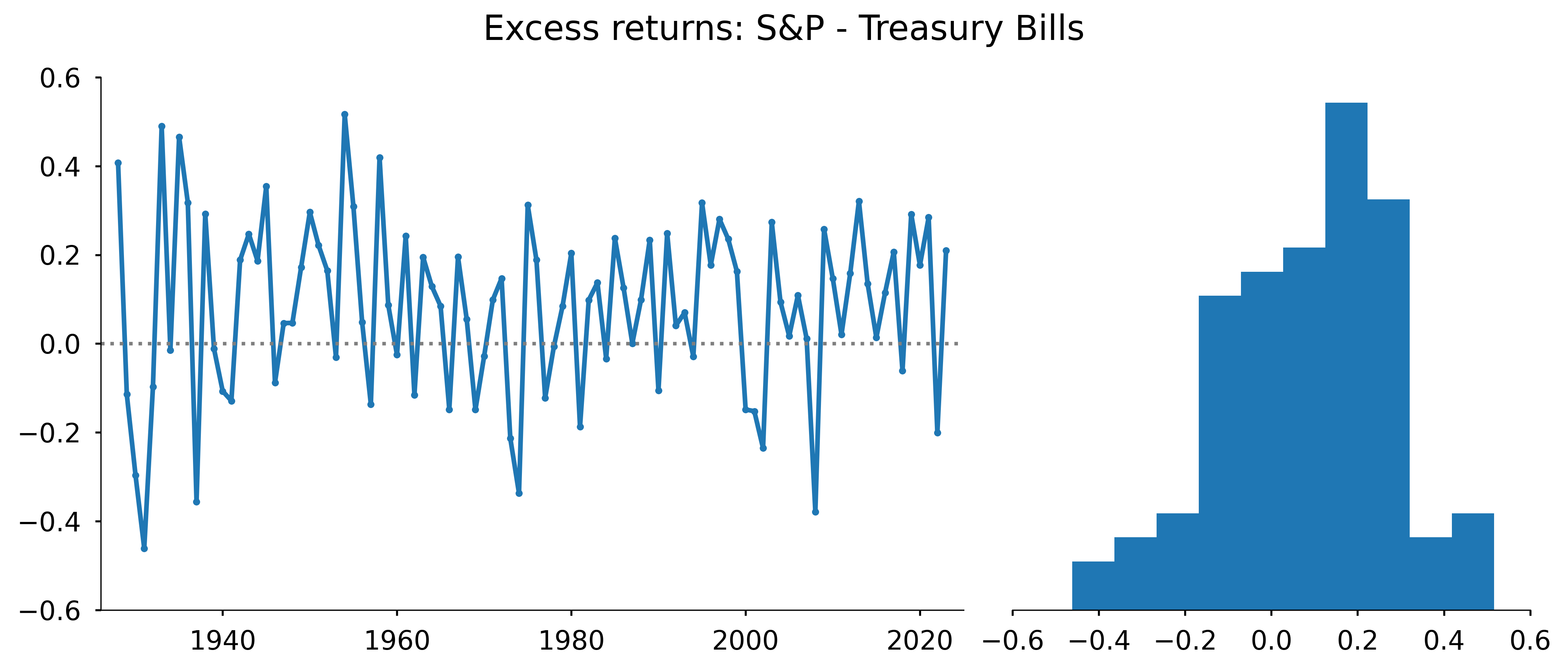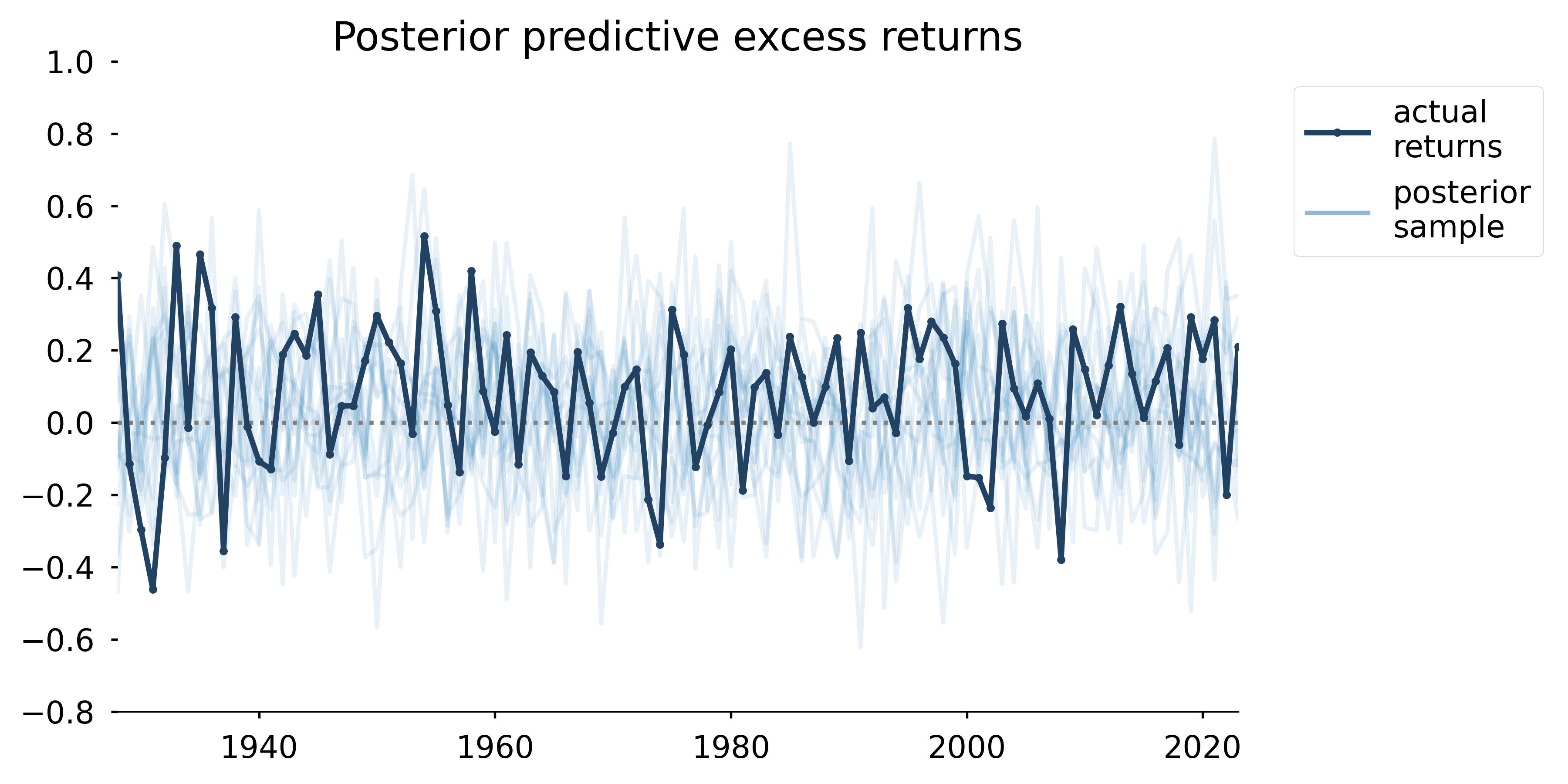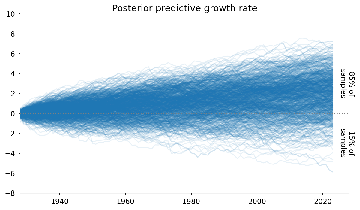 optimizer.step()Not only can we extract the usual summary statistics from the posterior predictive, but we can ask questions like, “how often do we expect this strategy to produce a loss after a 100 year investment period?”